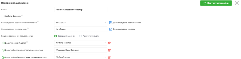 - “Зробити фоновим” — налаштування доступне лише при створенні нового Голосового робота. Якщо налаштування ввімкнене, робот буде створений як фоновий. Якщо він був створений як фоновий, звичайним його вже не можна зробити, як і навпаки.