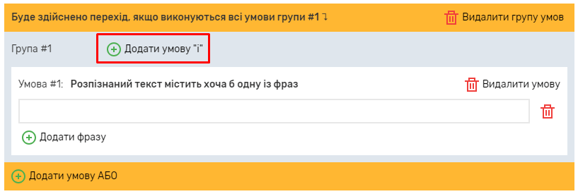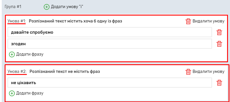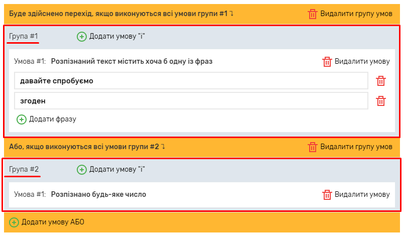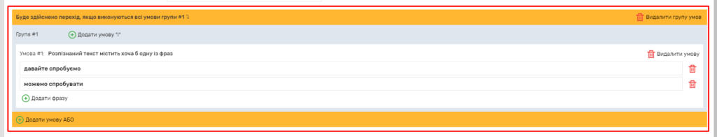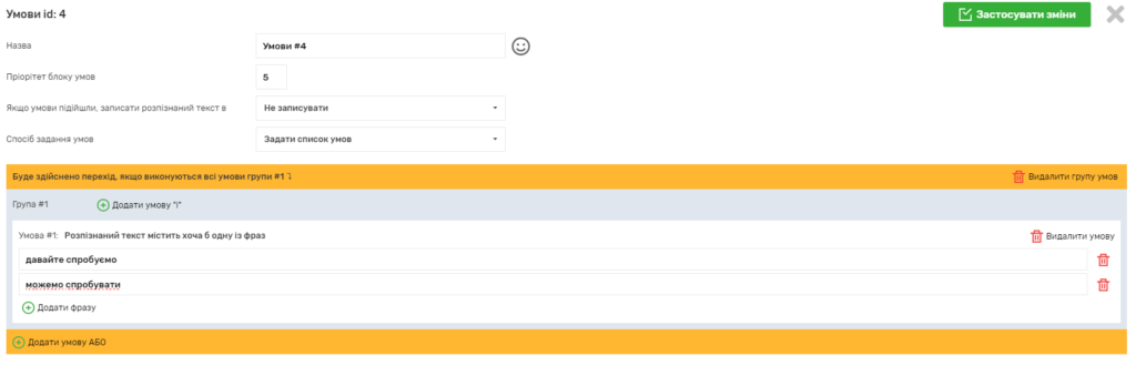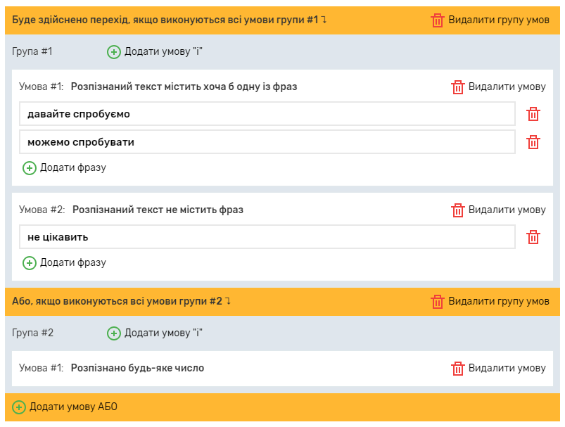 - Перехід буде виконано, якщо розпізнаний текст буде містити одну з фраз — “давайте спробуємо” або “можна спробувати” та не містить фразу “не цікавить” (тобто виконуються всі умови групи 1)