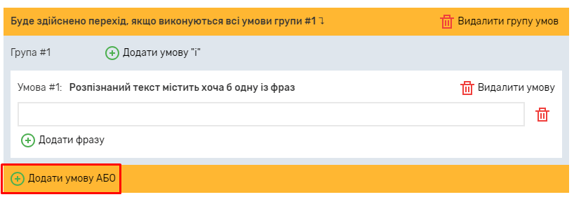 Перехід на поточний вузол буде виконаний, якщо розпізнаний текст на батьківському вузлі відповідатиме умовам переходу на поточний вузол. Текст відповідає умовам, якщо всі умови хоча б однієї з груп виконуються. Наприклад, в поточного вузла задані наступні умови переходу: