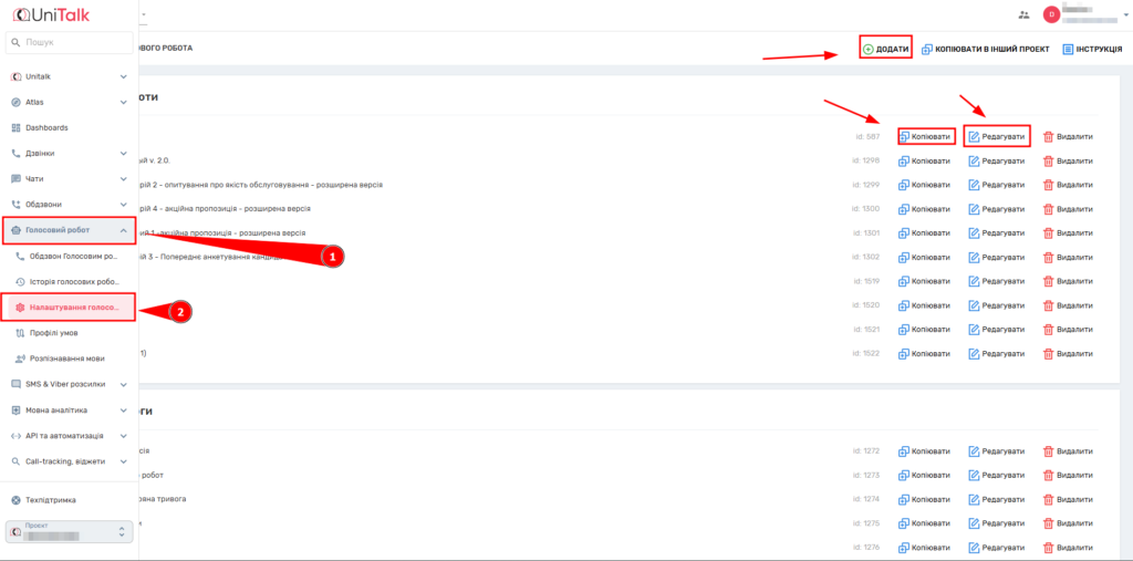 На сторінку редагування Голосового робота можна перейти лише зі сторінки Голосового робота, натиснувши на кнопку “Редагувати”, “Додати” або “Копіювати”.