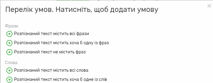 - В умовах переходу на дочірні вузли можна вказати не більше одного разу особливу умову з типом “Розпізнано будь-який текст”