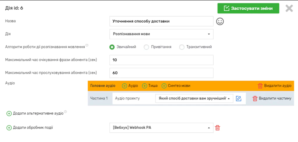 - Якщо за “Максимальний час очікування фрази абонента” абонент не почав говорити, очікуємо фінальний результат розпізнавання не більше, ніж “Максимальний час прослуховування абонента”.