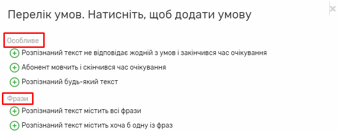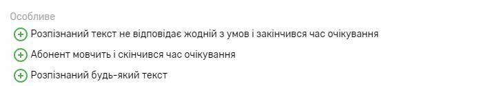 - Умову “Розпізнаний текст не відповідає жодній умові та закінчився час очікування” обов’язково необхідно вказати один раз в дочірніх вузлах одного вузла (щоб знати, куди переходити, якщо не виконається жодна з вказаних умов).