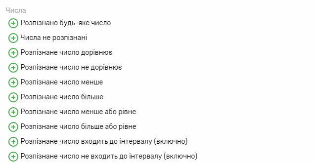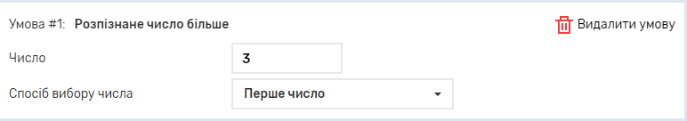 Ви можете вказати, які числа має бути в розпізнаному тексті. Для умов, окрім “Розпізнане будь-яке число” та “Числа не розпізнані” необхідно вказати будь-яке число або числовий проміжок та задати спосіб вибору числа.