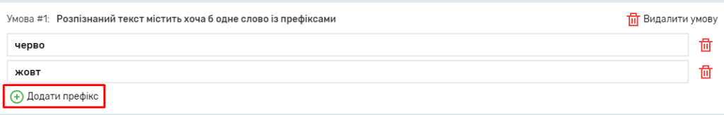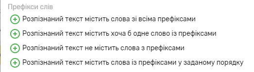 Налаштування префіксів вказують, з якими префіксами слова мають чи не мають міститись в розпізнаному тексті. Можна вказувати будь-яку кількість префіксів.