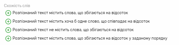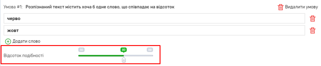 Налаштування схожості слів вказують, які слова має чи не має містити розпізнаний текст, але перевіряють не повне співпадіння, а наскільки слова схожі. Можна вказувати будь-яку кількість слів (кнопка “Додати слово”). Окрім слів, треба вказати “Відсоток схожості” — відсоток, на який мають бути схожі в розпізнаному тексті та слова, вказані в умові. Наприклад, слова “кора” та “кола” схожі на 75%.