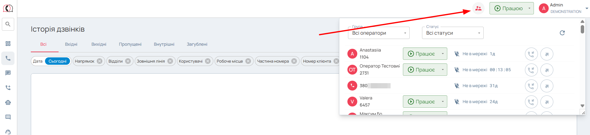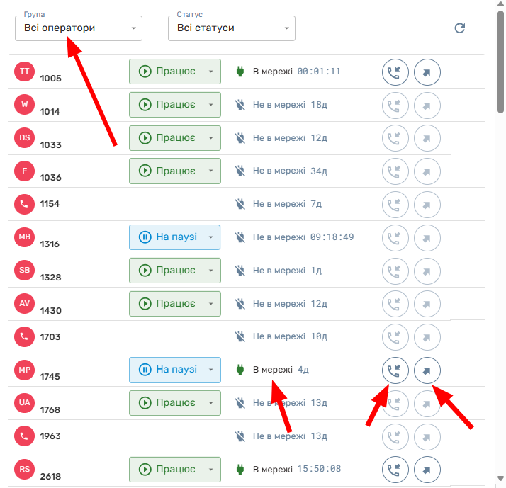 Завдяки вбудованому фільтру, можна відображати інформацію по всіх співробітниках або відділу (підрозділу), що цікавить. Найменування операторів відображає внутрішній номер телефону, його ім’я та прізвище (якщо ці дані введені в налаштуваннях проекту).