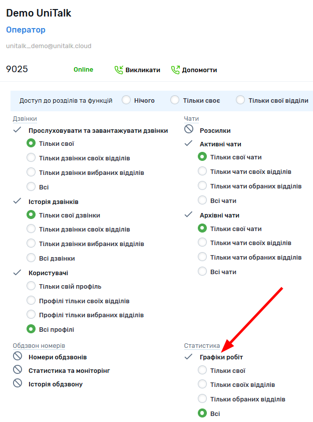 Доступ для співробітників, до панелі швидкого доступу і до самої сторінки “Моніторинг операторів”, керується галочкою “Графік робіт” на сторінці “Користувачі”.
