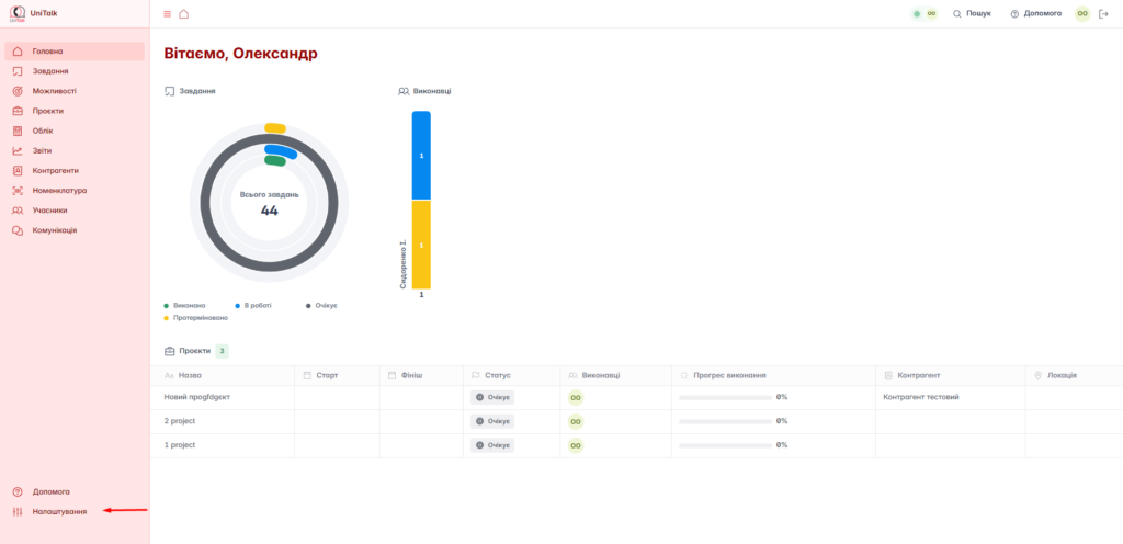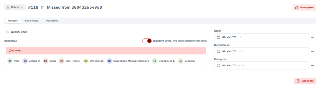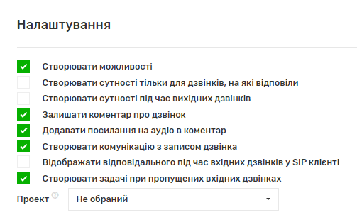 2. “Задачі” — сутність, яка створюється лише за пропущеними викликами. Тут можна налаштувати, за яким внутрішнім проєктом будуть закріплені задачі, адже буває кілька напрямків та проєктів, щодо яких ви спілкуєтесь з клієнтом. Задача створюється від додатку інтеграції UniTalk, її може виконувати один або кілька співробітників, яких можна призначати.