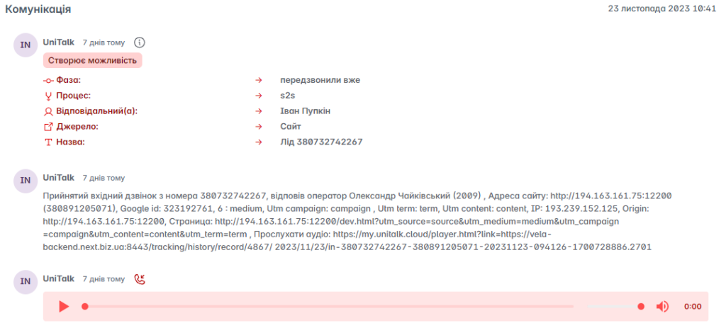 — “комунікація з записом дзвінка” дає змогу передавати посилання на вбудований плеєр Keruj CRM для прослуховування дзвінка прямо з картки.