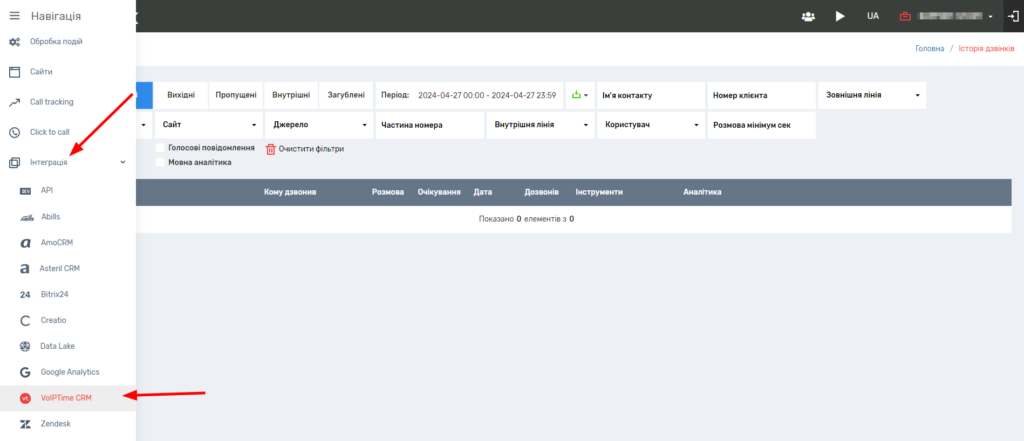 - В особистому кабінеті UniTalk перейдіть у розділ “Інтеграція” та виберіть VoIPTime CRM.