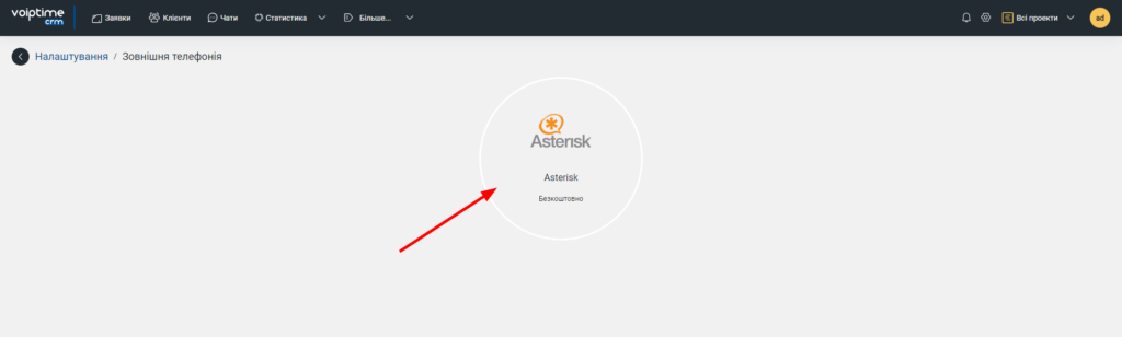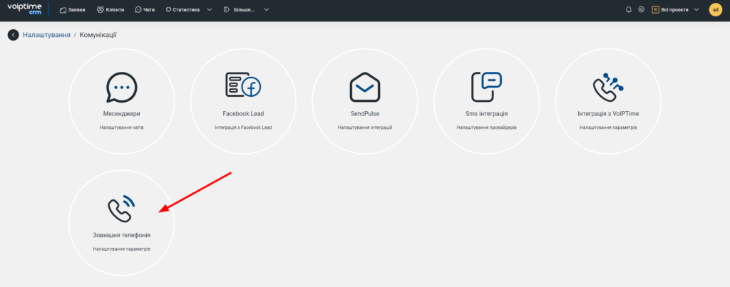 7. Далі налаштовуємо інтеграцію зі сторони CRM-системи. Для цього необхідно налаштувати інтеграцію з зовнішнім сервісом телефонії. В особистому кабінеті VoIPTime CRM у налаштуваннях зайдіть у розділ “Інтеграції”.