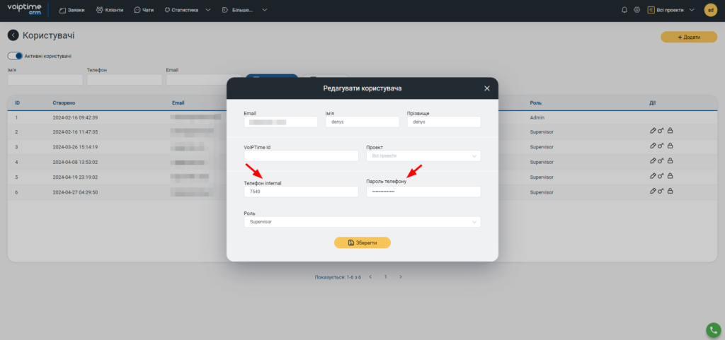 8. Далі необхідно вказати реєстраційні дані SIP для кожного користувача CRM-системи, який працює на дзвінках. Цю інформацію можна знайти в особистому кабінеті UniTalk у розділі “Користувачі”.