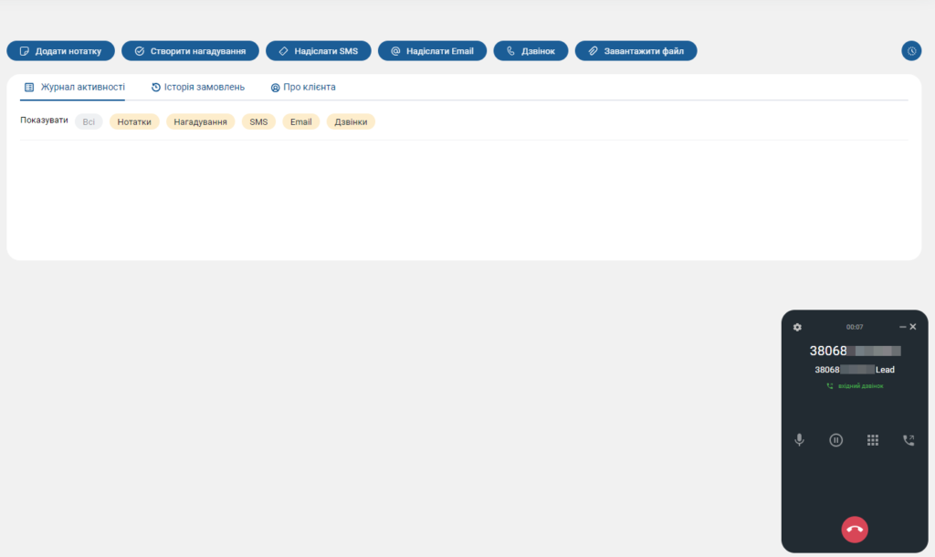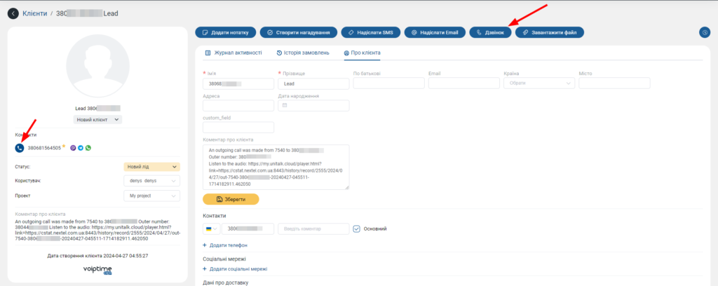 9. Уже можна здійснювати дзвінки з CRM. Для цього слід перейти до картки клієнта та натиснути на кнопку “Дзвінок” або піктограму біля номеру телефону контакту.