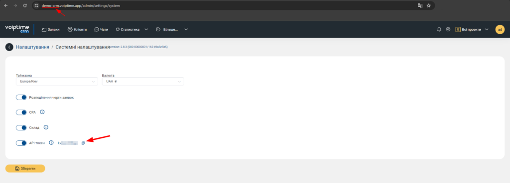 2. В особистому кабінеті VoIPTime CRM у розділі “Налаштування” у вкладці “Системні налаштування” скопіюйте піддомен CRM-системи та API-токен.