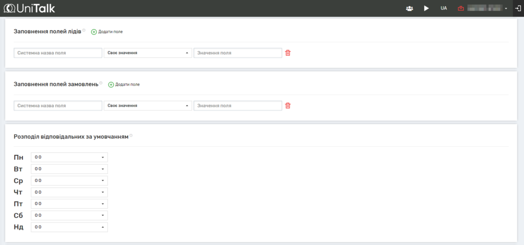 Також можна заповнювати поля лідів та замовлень, встановлювати відповідальних за пропущені вхідні дзвінки. Це можна зробити, якщо за кожним днем тижня встановити відповідального.