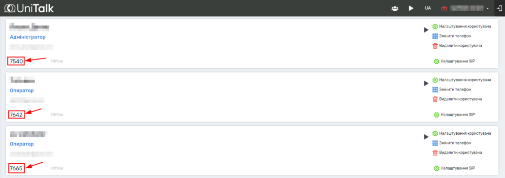 5. Наступний крок — закріплення за користувачами CRM-системи номерів SIP ліній. Ці номери можна подивитись в особистому кабінеті UniTalk у розділі “Користувачі.”
