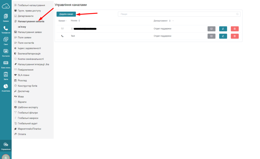 Для підключення та налаштування цієї інтеграції, Вам необхідно в HelpDeskEddy перейти в розділ «Керування», в меню вибрати «Налаштування каналів зв’язку», після чого натиснути кнопку «Додати канал»: