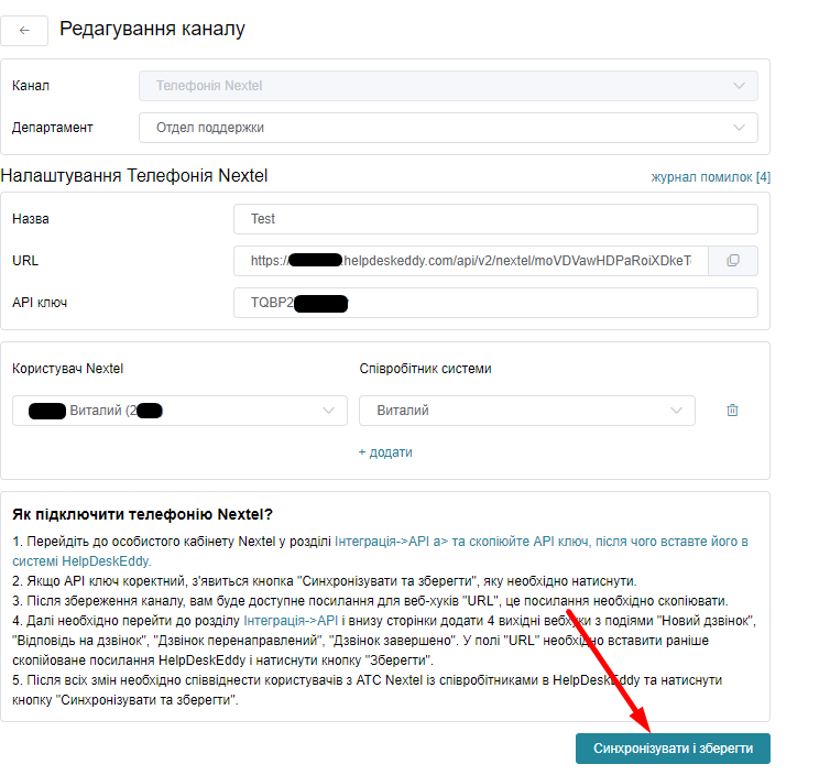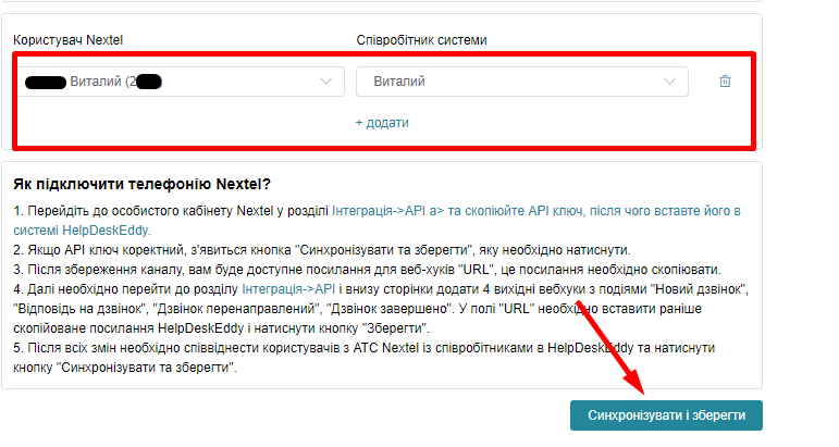 - Для завершення налаштування, необхідно синхронізувати користувачів з Віртуальної АТС UniTalk зі співробітниками в системі HelpDeskEddy і натиснути «Синхронізувати і зберегти»: