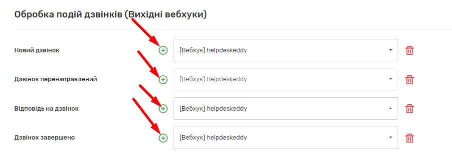 - Далі, у розділі Інтеграція->API, необхідно додати чотири вихідні вебхуки внизу сторінки з такими подіями: «Відповідь на дзвінок», “Новий дзвінок”, “Дзвінок завершено” і “Дзвінок перенаправлено”. У поле «URL» вставляємо посилання, яке раніше скопіювали з HelpDeskEddy, і зберігаємо, натиснувши кнопку «Зберегти».