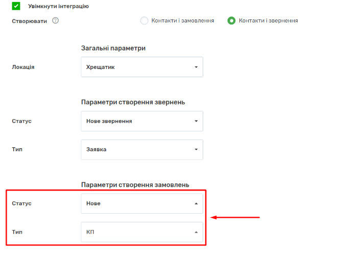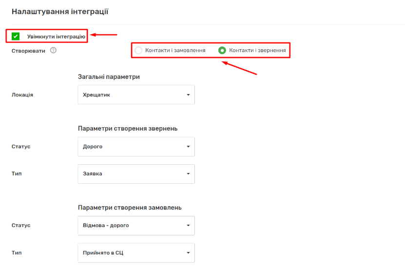 3. Відмітьте галочкою поле “Увімкнути інтеграцію”. Виберіть одну з запропонованих опцій: “Контакти та замовлення” або “Контакти та звернення”.