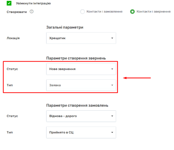 5. У розділі “Параметри створення звернень” або “Параметри створення замовлень” налаштуйте статус і тип відповідно звернень або замовлень.