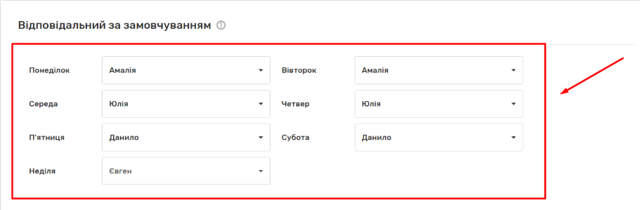 6. У розділі “Відповідальний за замовчуванням” можете вказати дані відповідального менеджера для пропущених дзвінків. Можна призначити одного або кілька менеджерів. Можна призначити різних відповідальних у різні дні тижня. Якщо такої потреби у вас немає, поле “Відповідальний за замовчуванням” можна залишити пустим.