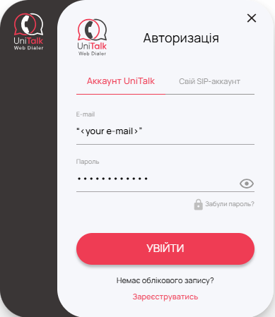 де “<your e-mail>” — ваша електронна пошта, яка була вказана під час реєстрації в особистому кабінеті UniTalk та натиснути “Увійти”.
