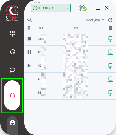 Зліва відображається статус користувача (працює, на паузі, або завершив роботу), далі його внутрішній номер, ім’я та статус робочого місця в АТС (у мережі чи не в мережі).