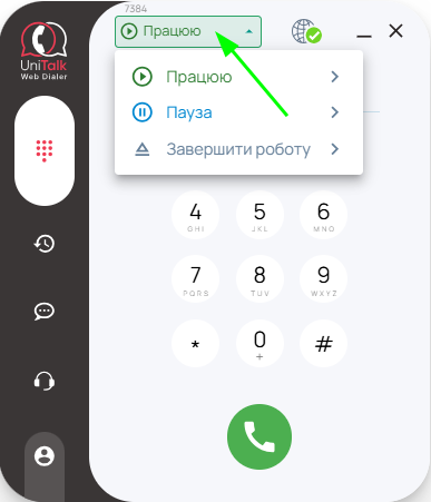 Якщо Ви зайшли в UniTalk Web Dialer викорстовуючи обліковий запис UniTalk, Ви можете змінювати статус роботи напряму з UniTalk Web Dialer.