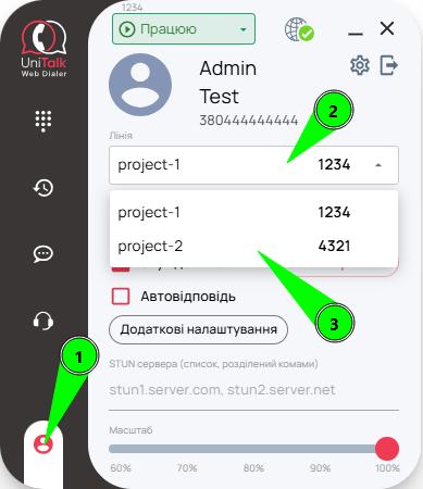 Якщо Ви зайшли в UniTalk Web Dialer викорстовуючи обліковий запис UniTalk, Ви можете перемикатися між SIP-лініями призначеними Вам в різних проєктах. Для цього, спочатку відкрийте вкладку облікового запису та налаштувань (1), потім відкрийте випадаючий список, в якому показано наразі вибранку лінію (2), та виберіть лінію, на яку Ви бажаєте переключитися (3).
