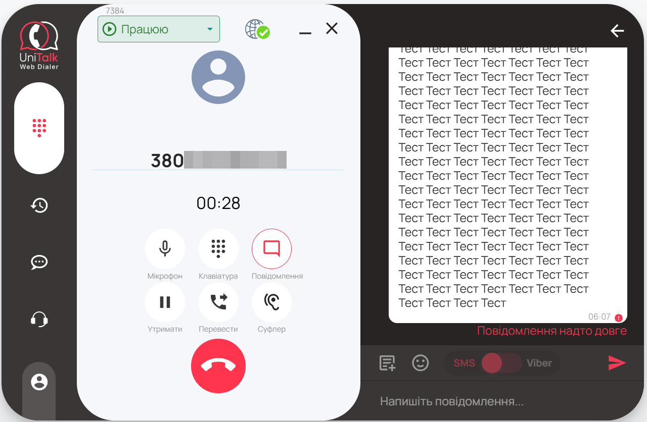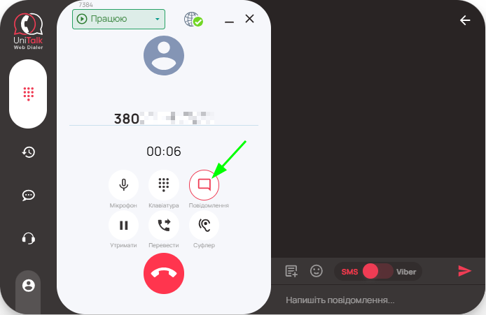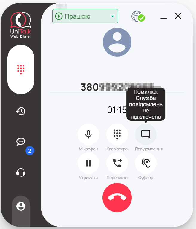 Під час дзвінку, ви можете надіслати СМС або Viber повідомлення клієнту натиснувши кнопку “Повідомлення”. Для використання даного функціоналу необхідно, щоб в особистому кабінеті UniTalk (на вкладці “Альфа-імена”: https://my.unitalk.cloud/messaging/alpha-names) було попередньо налаштовано сервіс відправки повідомлень. Якщо даний сервіс не налаштовано в проєкті, кнопка “Повідомлення” буде неактивна, і при наведенні на неї буде відображено попередження:
