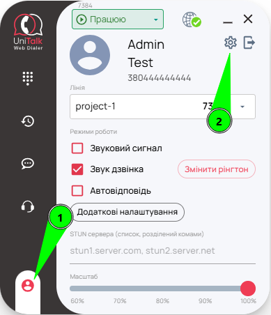 Якщо Ви зайшли в UniTalk Web Dialer викорстовуючи обліковий запис UniTalk, Ви можете швидко перейти на сторінку особистого кабінету UniTalk з розширення. Для цього, спочатку перейдіть на сторінку облікового запису та налаштувань (1), потім натисніть на кнопку-шестірню (2).