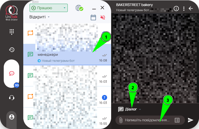 Після обирання потрібної групи, щоб почати комунікацію варто просто натиснути на чат який Вас цікавить, збоку дайлера з’явиться додатково суміжне вікно в якому , буде можливість написати , та відправити повідомлення