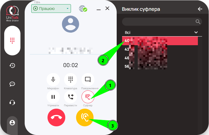Під час розмови оператор може зателефонувати суфлеру безпосередньо через інтерфейс UniTalk Web Dialer. Суфлер — це третій учасник дзвінка, який чує обох співрозмовників і може давати підказки оператору. При цьому клієнт суфлера не чутиме.