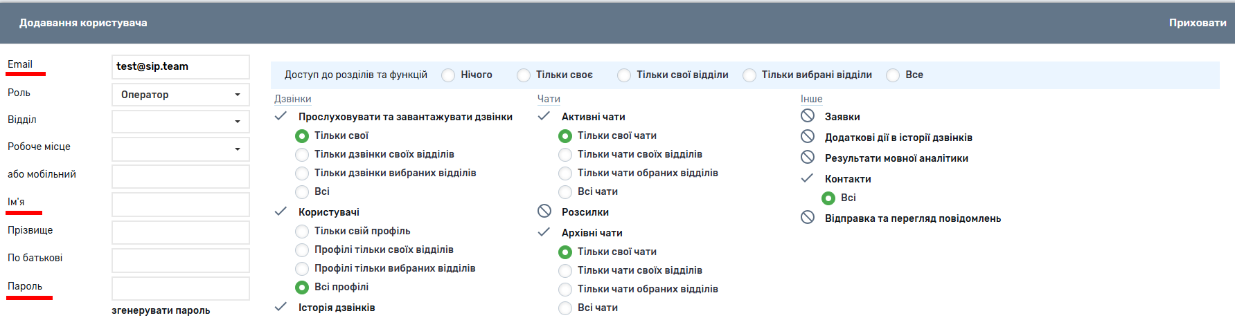 3. Після введення адреси електронної пошти відбудеться миттєва перевірка її валідності. Далі потрібно вказати мобільний номер співробітника або вибрати відповідну SIP лінію. Після цього з’являться додаткові поля для введення ПІБ та пароля.