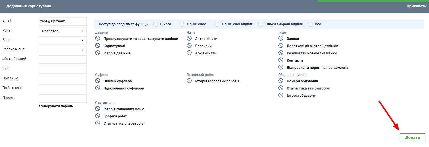 4. Після заповнення всіх обов’язкових полів та визначення рівня доступу та включення додаткових функцій, не забудьте натиснути кнопку “Додати”.
