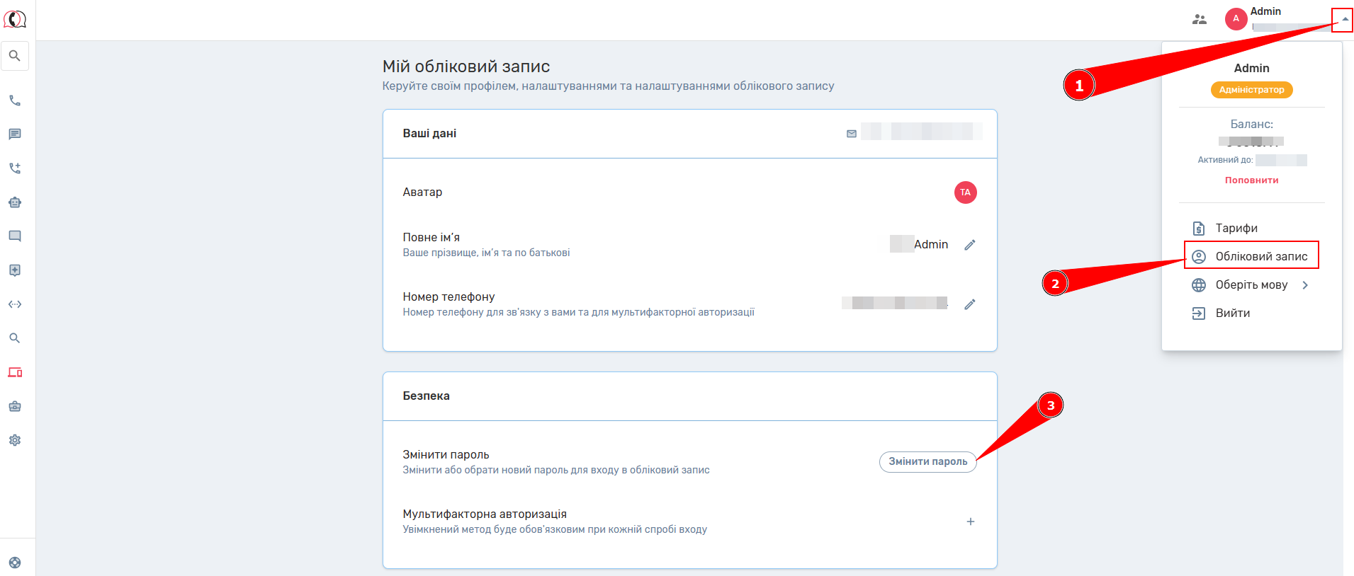 Щоб перейти у налаштування облікового запису, необхідно, у правому верхньому кутку, натиснути на стрілочку(1), та у відкритому меню обрати “Обліковий запис”(2). Користувача буде переадресовано на сторінку облікового запису, де користувач може скористатися функцією “Змінити пароль”(3)