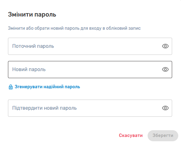 У відкритому вікні користувачу необхідно спочатку ввести поточний пароль. Після цього користувач, може ввести свій пароль або згенерувати випадковий, після чого, підтвердити його у останньому полі. Після заповнення всіх полів, не забудьте натиснути “Зберегти”