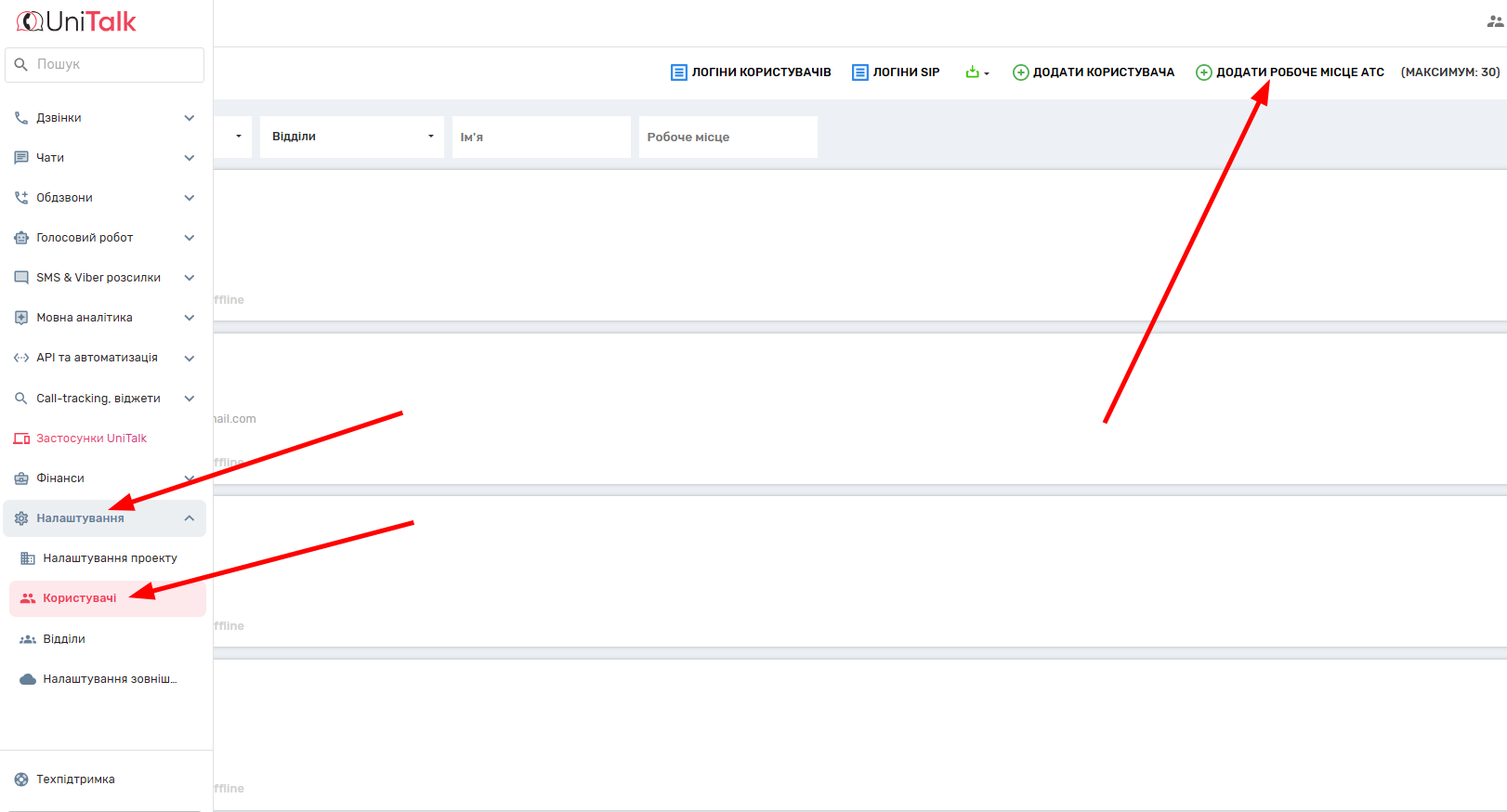 4. Незалежно від того, яке підключення ви оберете, вам потрібно буде увійти в розділ “Налаштування” -> “Користувачі” особистого кабінету на веб-сайті UniTalk.