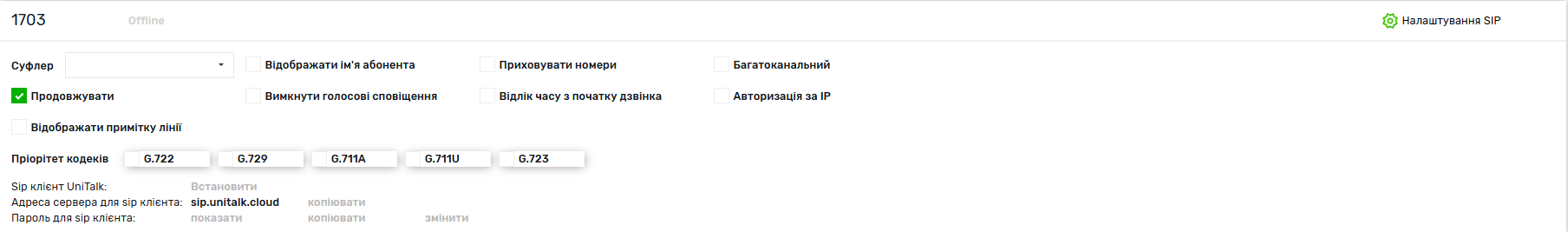 5. Розгорнувши налаштування відповідної SIP-лінії, ви отримуєте доступ до параметрів цієї SIP-лінії – логіну, паролю та адреси сервера. Ці параметри вам потрібно буде ввести в налаштування програми для здійснення дзвінків.