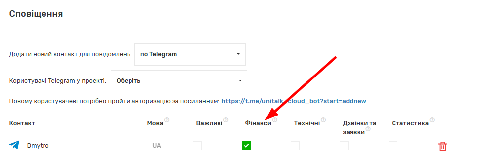 Повідомлення буде доставлене на email або Telegram, навпроти яких було поставлено галочку “Фінанси”.