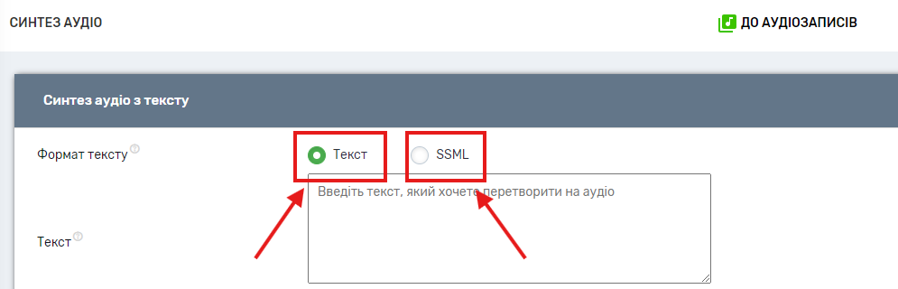 Текст, який Ви бажаєте перевести в аудіо, може бути як у звичайному форматі, так і в форматі SSML.