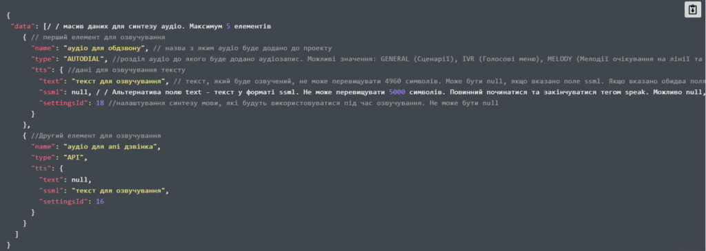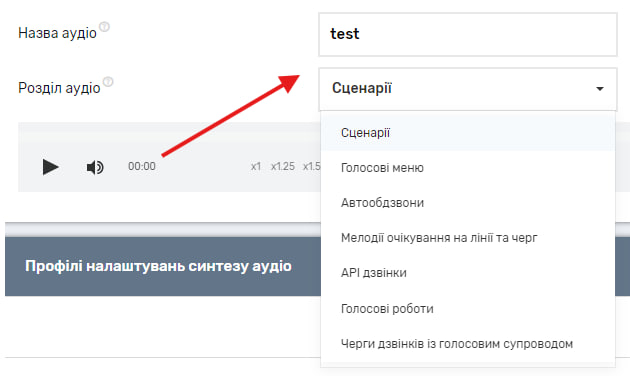 У розділі “Синтез аудіо” в особистому кабінеті Ви можете створювати власні аудіо файли з тексту одразу додаючи їх в необхідний Вам функціонал: у вхідні сценарії, голосове меню, обдзвони, мелодії очікування в черзі з супроводженням, в АРІ дзвінках.