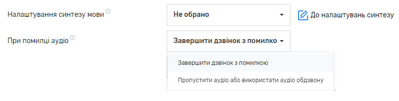 Синтез аудіо в такому випадку відбувається буквально під час дзвінка, тому в разі, якщо сталася помилка під час синтезу аудіо, є можливість обрати: дзвінок завершиться зі статусом “Помилка аудіо” або буде використовуватися загальне аудіо обдзвону.