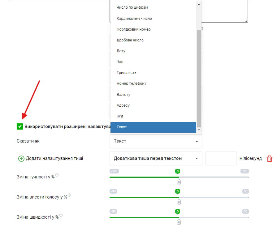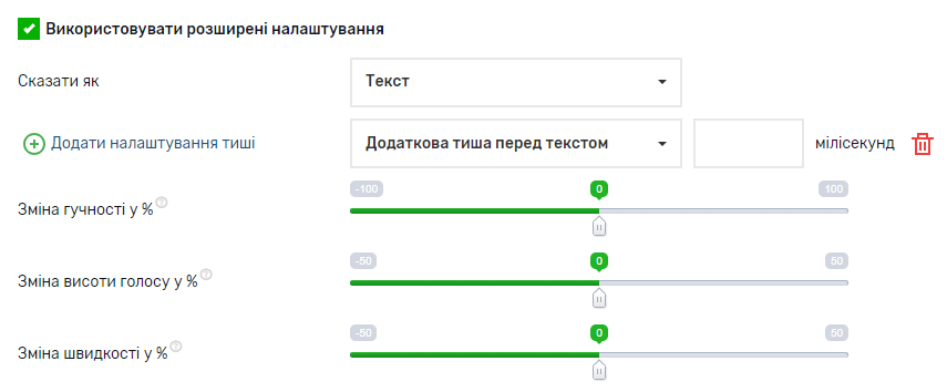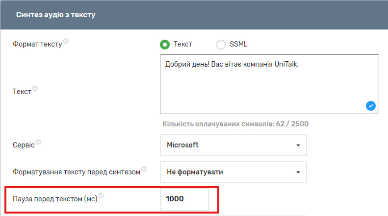 Ось тут можна вибрати паузу перед текстом, яка вимірюється в мілісекундах. 1 секунда = 1000 мілісекунд. Тривалість паузи також впливає на кількість оплачуваних символів.