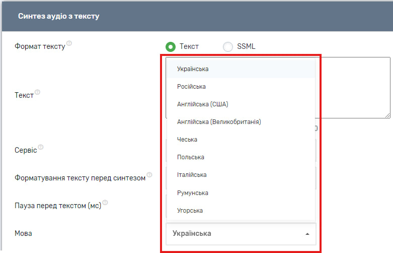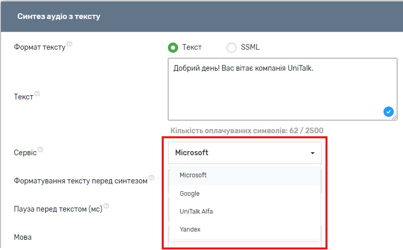 Також можна обрати сервіс через який буде синтезуватися мова. У списку доступних наразі сервіси від Microsoft, Google, UniTalk Alfa, Yandex.