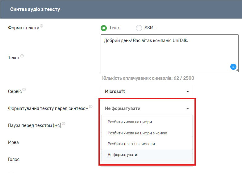 Крім того, є можливість відформатувати текст перед синтезом. У форматування входить розбиття числа на цифри або на цифри з комою, розбиття тексту на символи. Налаштування не працює для синтезу тексту у форматі SSML. Також варто зазначити, що тип форматування впливатиме на кількість оплачуваних символів.