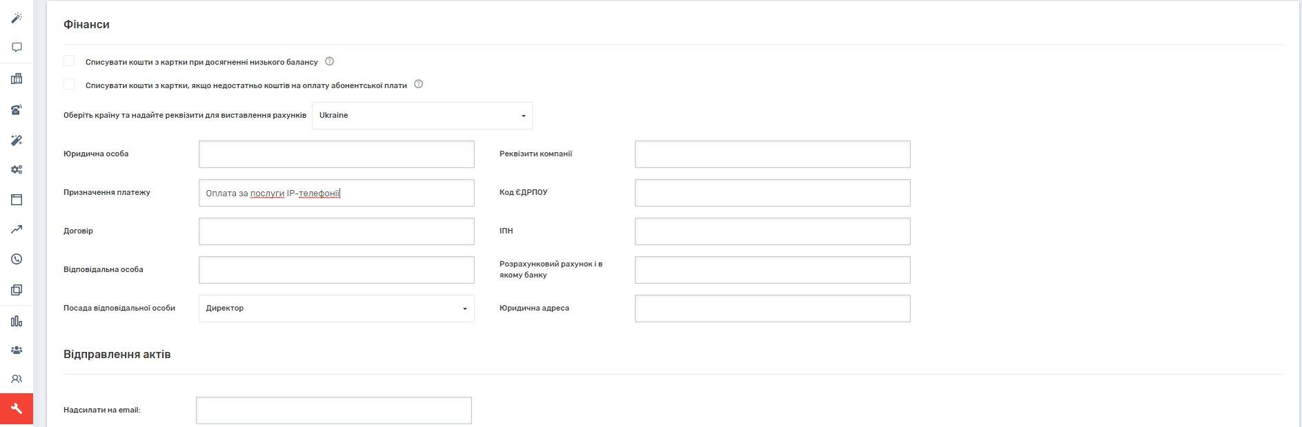 Якщо потрібно, щоб ці поля автоматично заповнювалися даними вашої компанії як платника і в них зазначалося певне призначення платежу, перейдіть у особистому кабінеті до розділу “Налаштування проекту” у підрозділі “Фінанси”, введіть та збережіть необхідні дані у полях “Реквізити компанії” (наприклад, назва юридичної особи, ФО-П, ОКПО) та “Призначення платежу” (наприклад, “Оплата за послуги IP-телефонії”) – введені вами дані в подальшому автоматично підтягуватимуться та відображатимуться у відповідних рядках в рахунках та актах виконаних робіт.