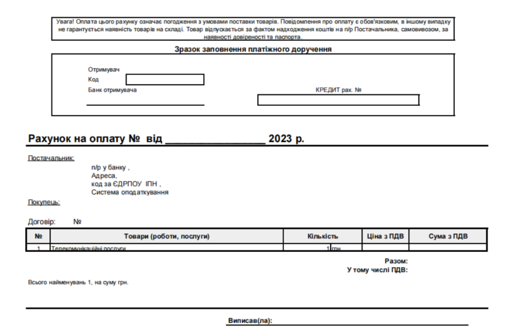 Примітка. Оплата, згідно з рахунком-фактурою, можлива в будь-якому банку України. Термін надходження коштів на баланс – 3 робочих дні.